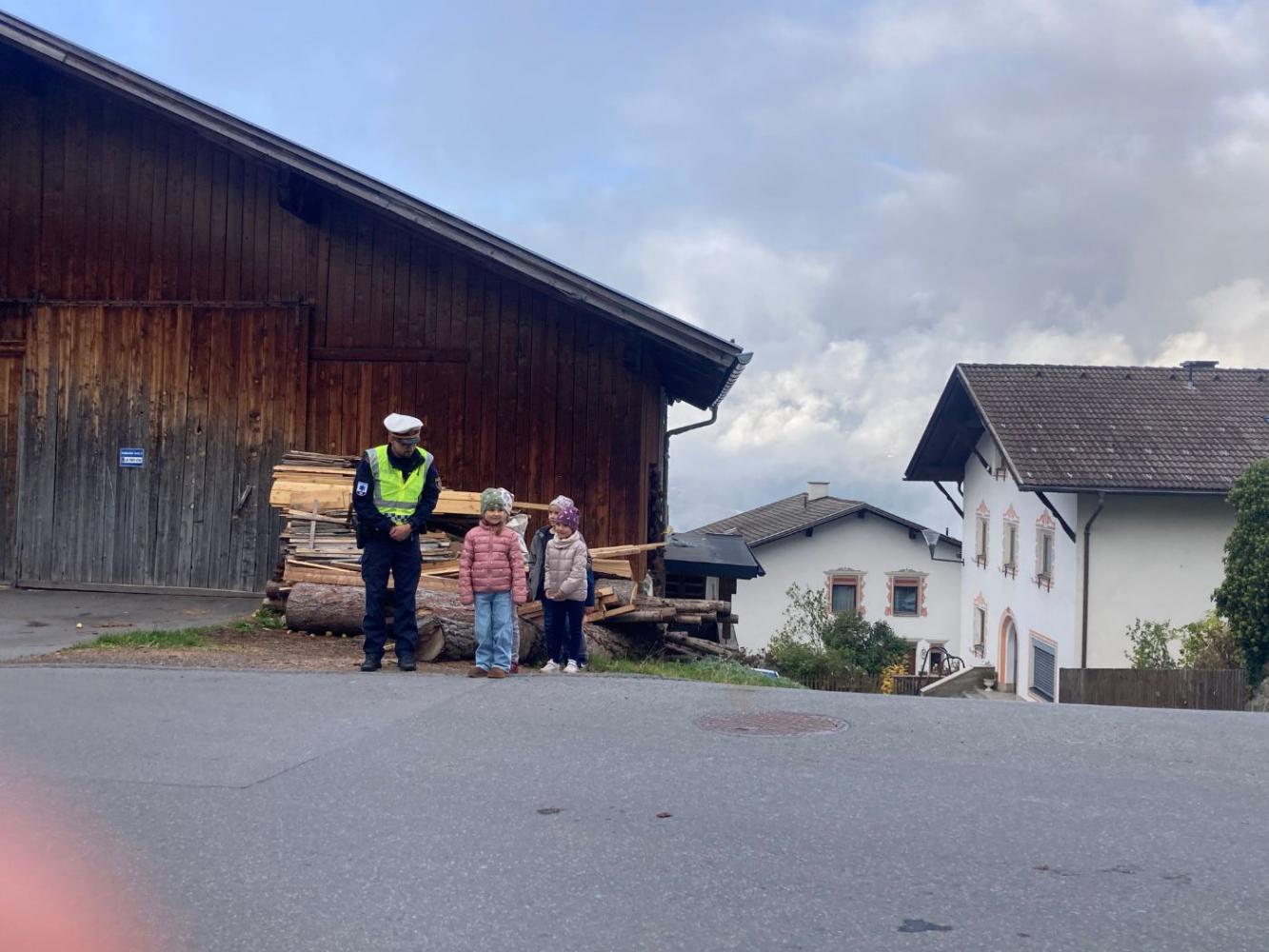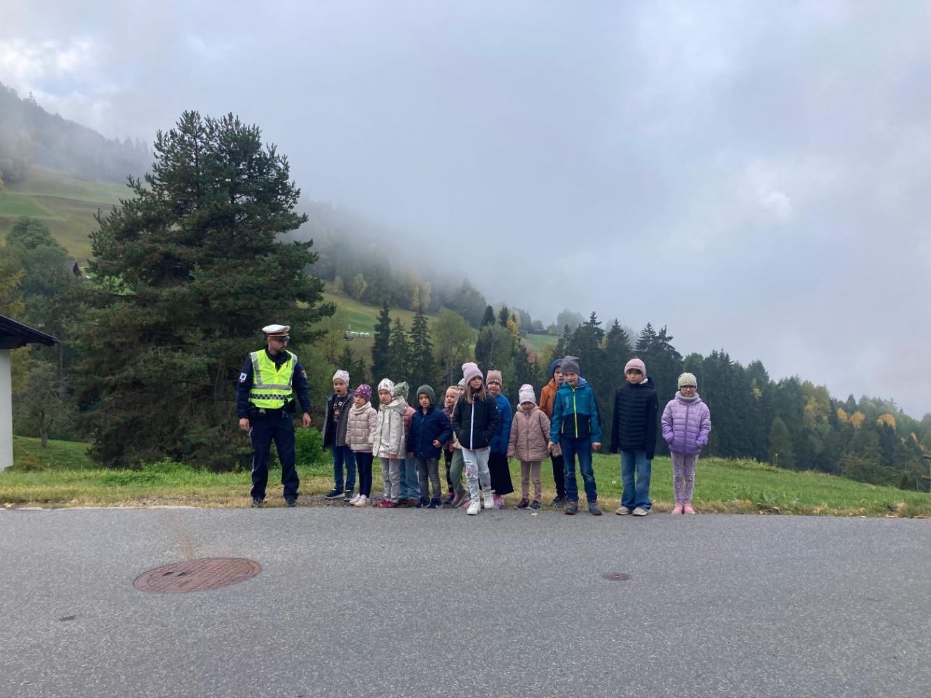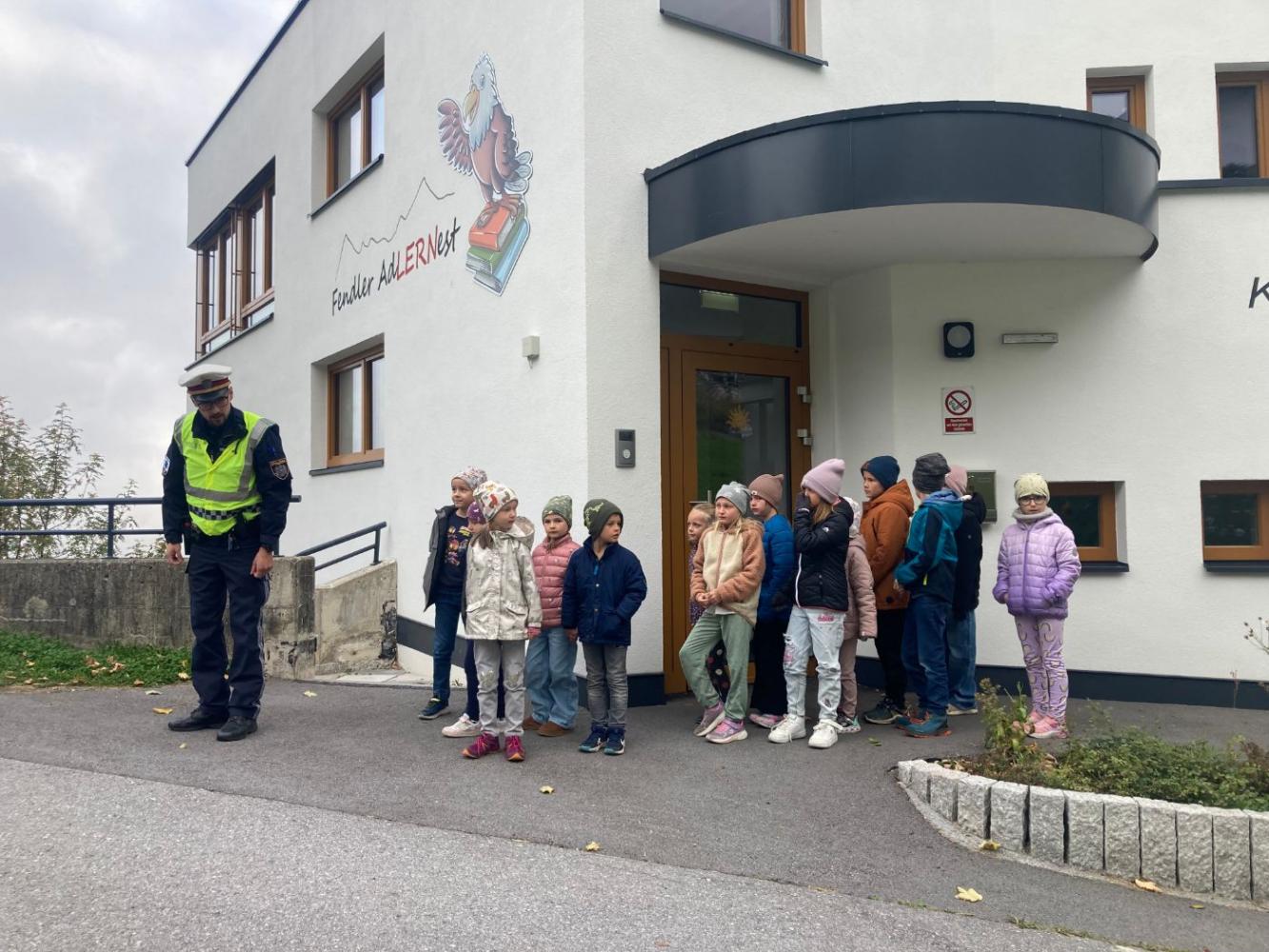 Im Anschluss ging es gemeinsam nach draußen. Auf einem Rundgang durch die Umgebung übten die Kinder das sichere Überqueren der Straße und besprachen unterschiedliche Verkehrssituationen an realen Kreuzungen. Dabei konnten sie das Gelernte gleich in der Praxis anwenden und wertvolle Tipps vom Profi erhalten.